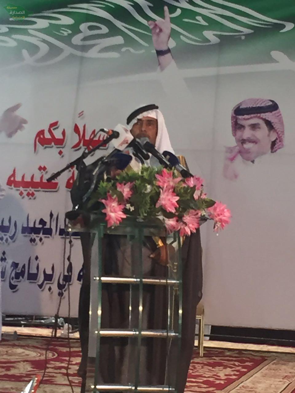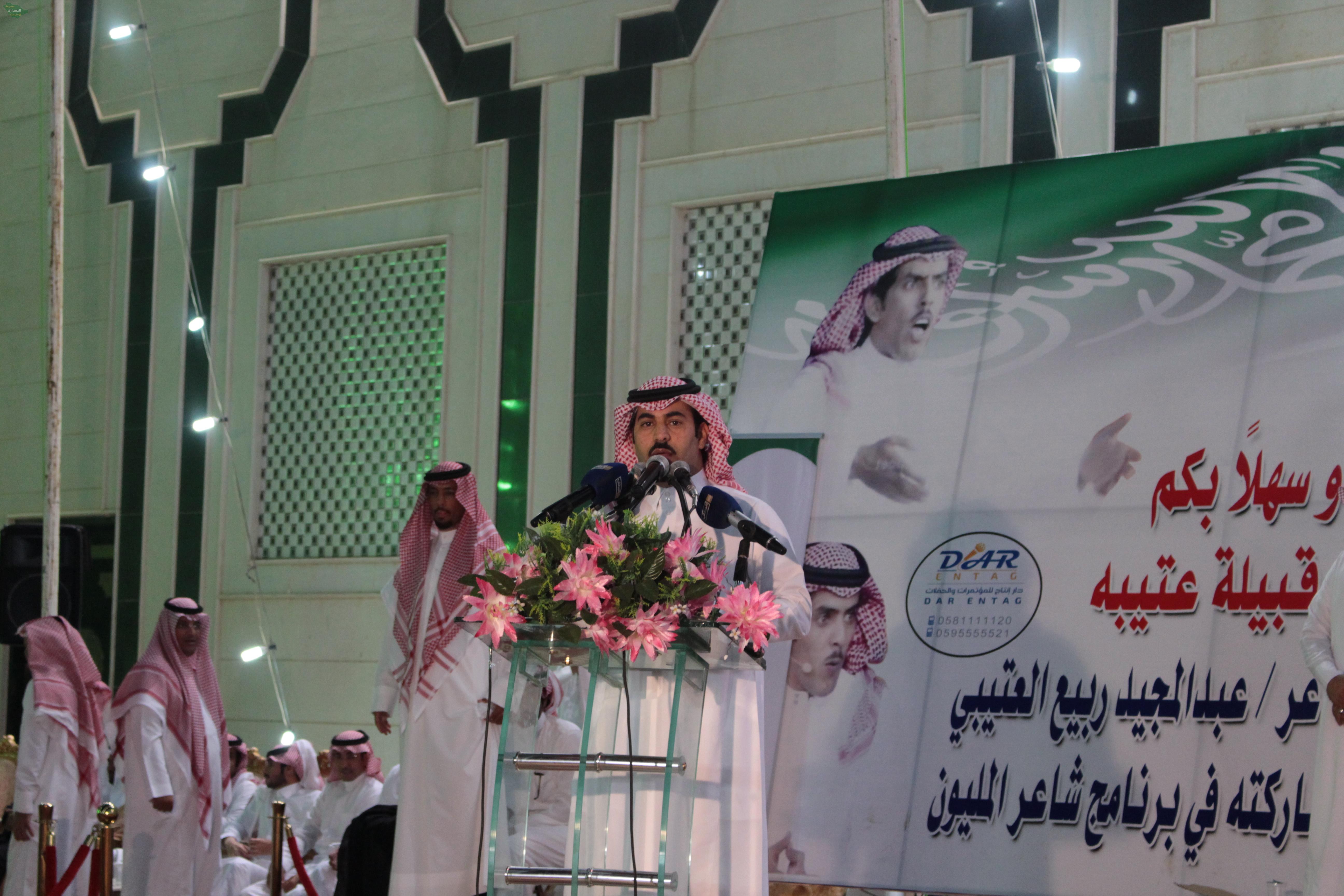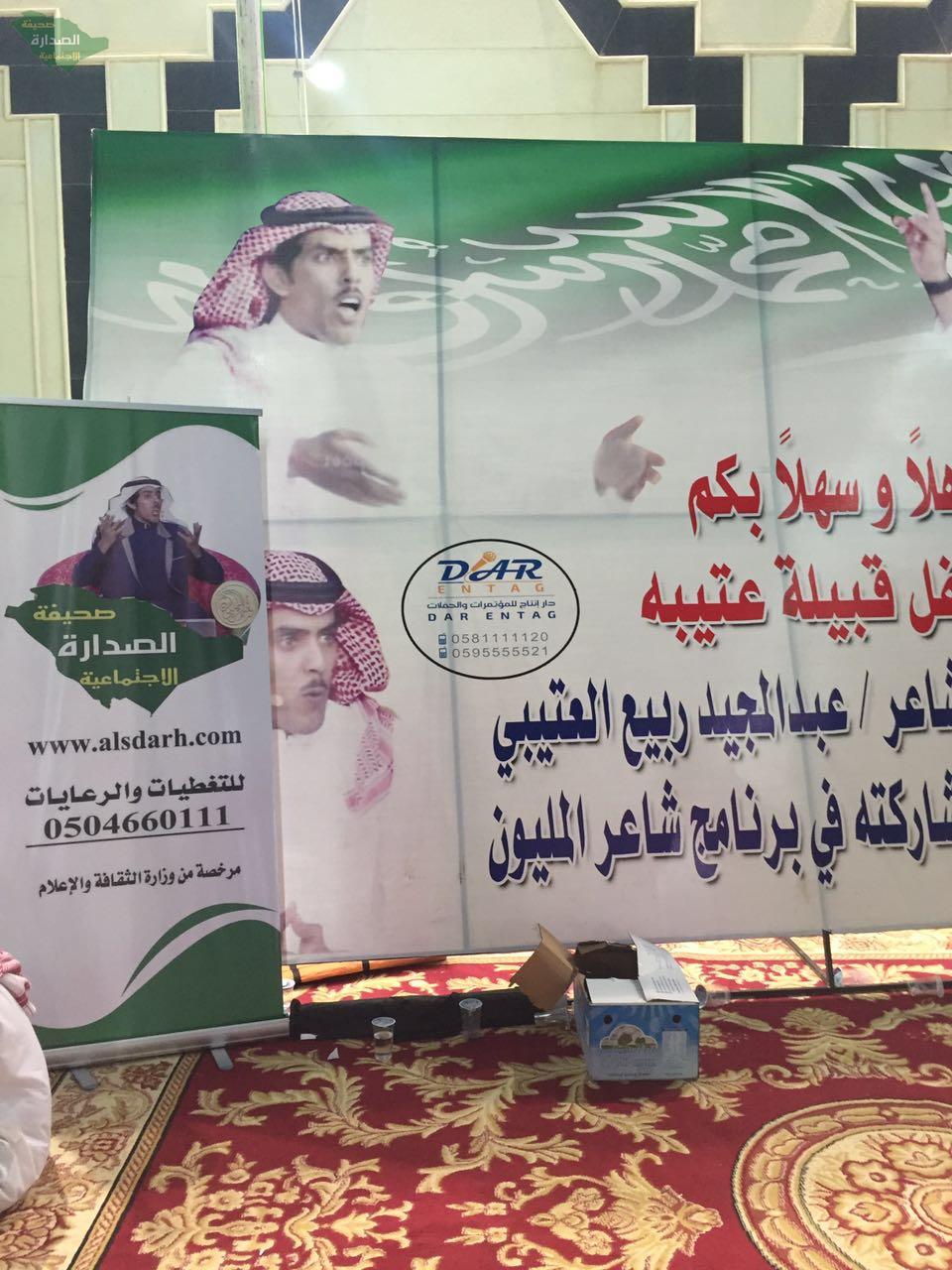 وسط حضورغفير من جميع اقطار دول الخليج العربي وبحضور شيوخ ووجهاء وأعيان القبائل والعوائل والشعراء والإعلاميين وجمهورالشعر أقامت قبيلة عتيبة حفلاً لدعم ممثلها في برنامج شاعر المليون الشاعر عبدالمجيد ببن ربيع الذيابي حيث كانت ليلة كرنفالية تنوعت فيها المشاركات وتفاعل الحضور مع تلك المشاركات التي لم تشهدها الساحة الشعرية منذو سنوات .