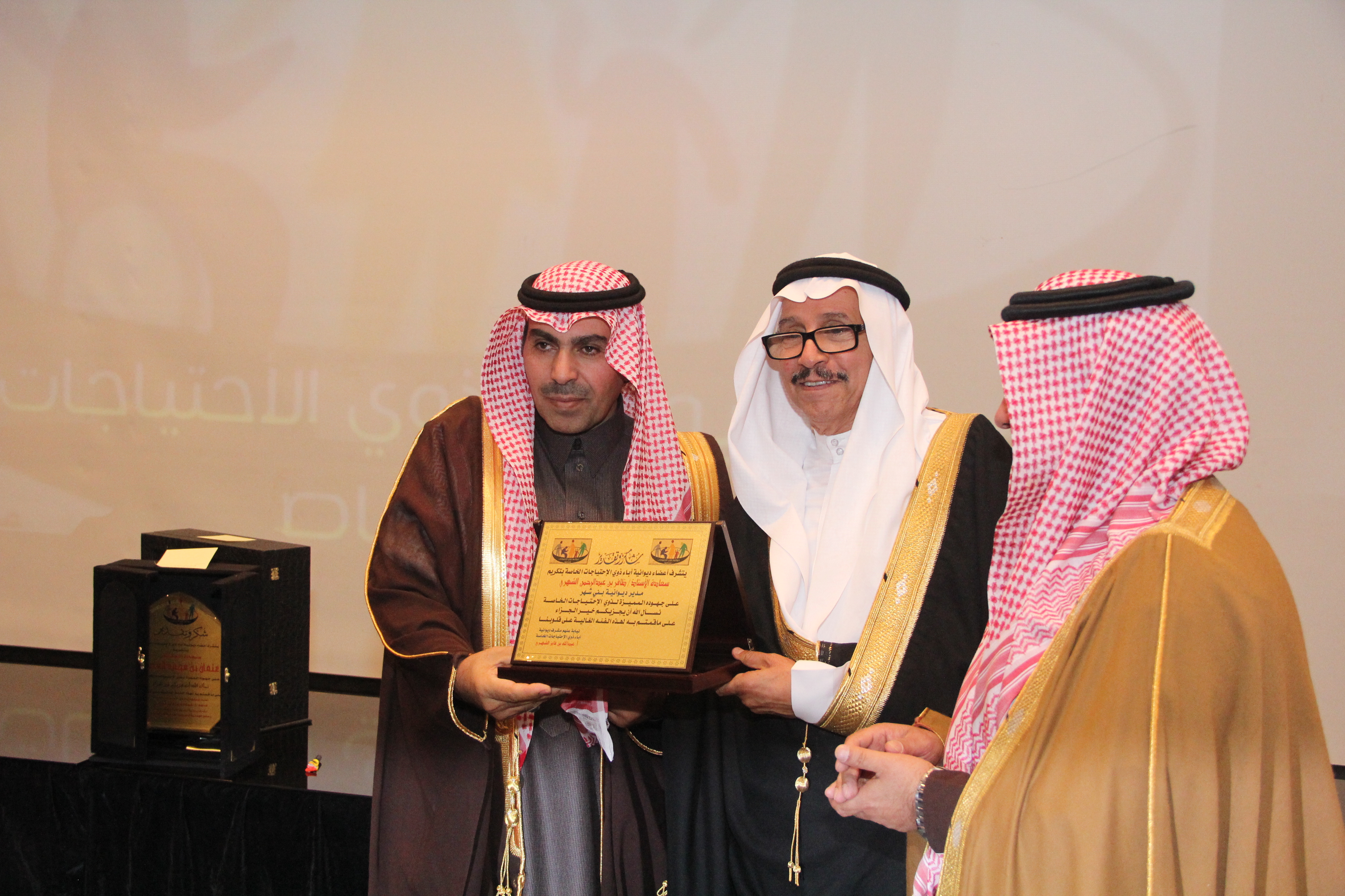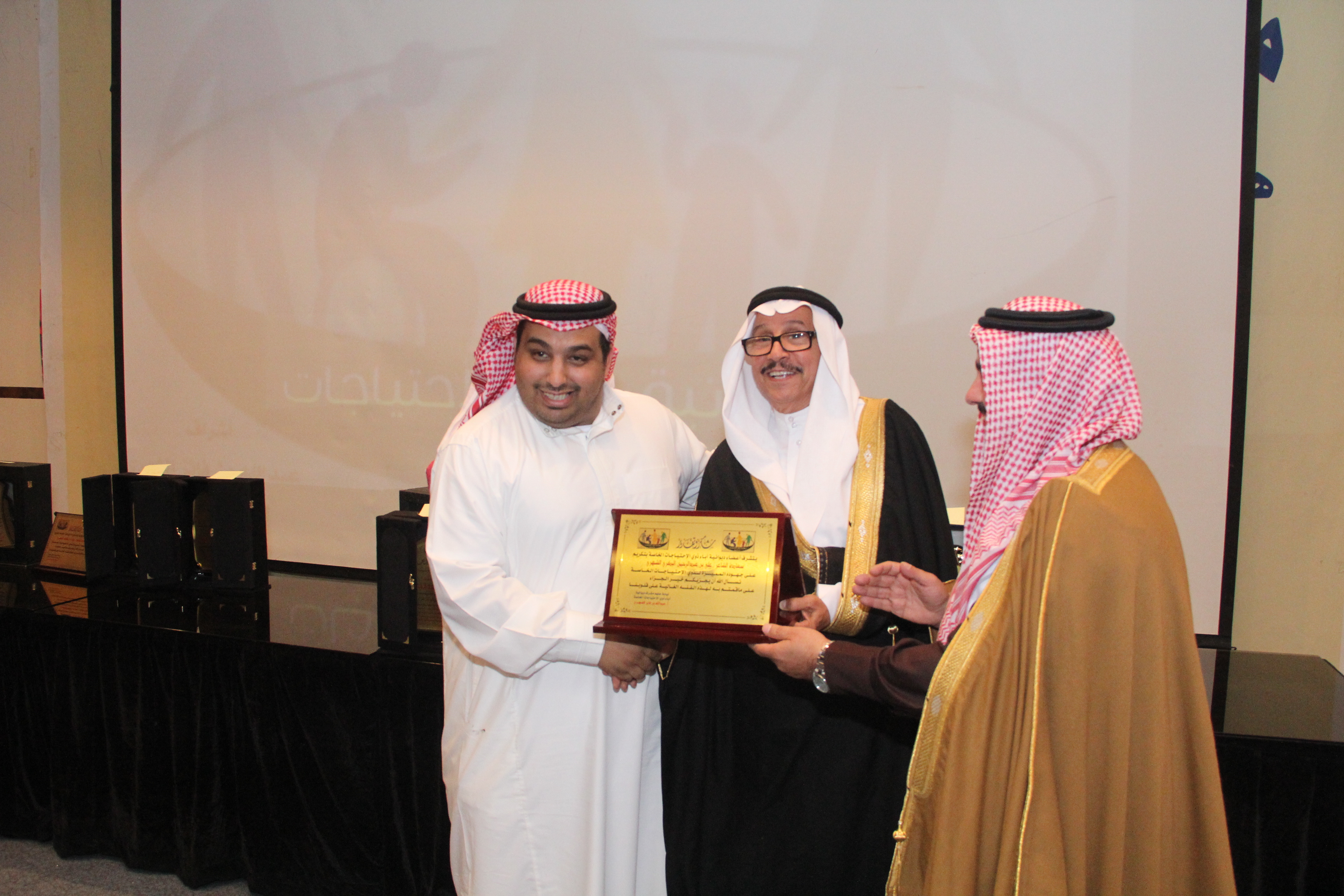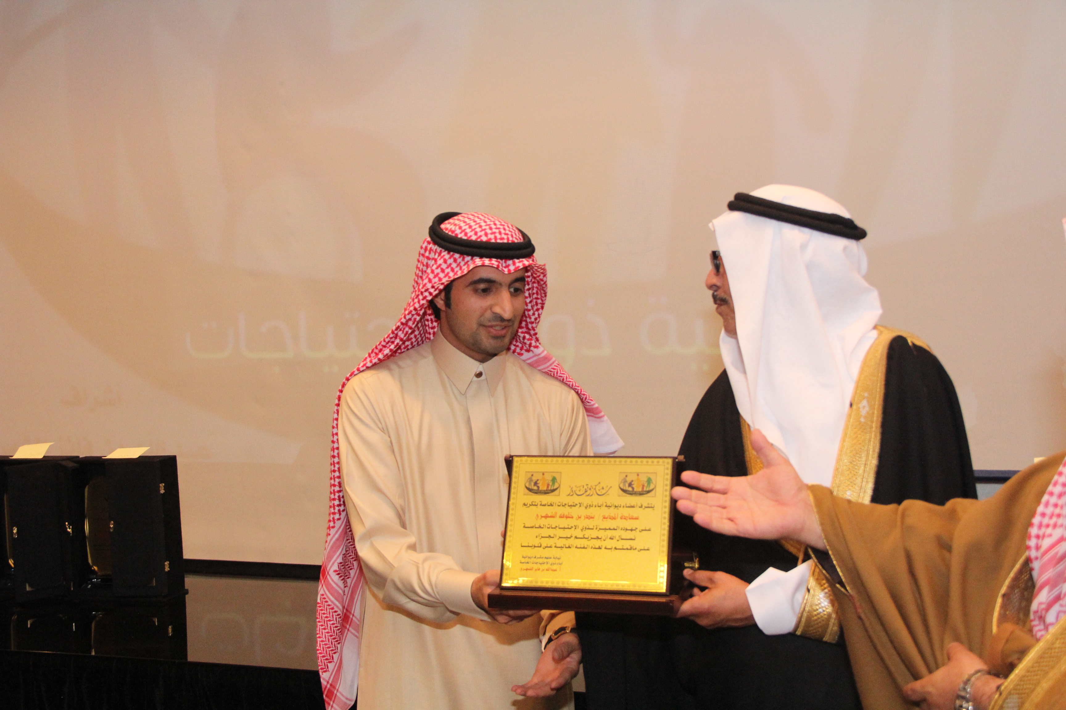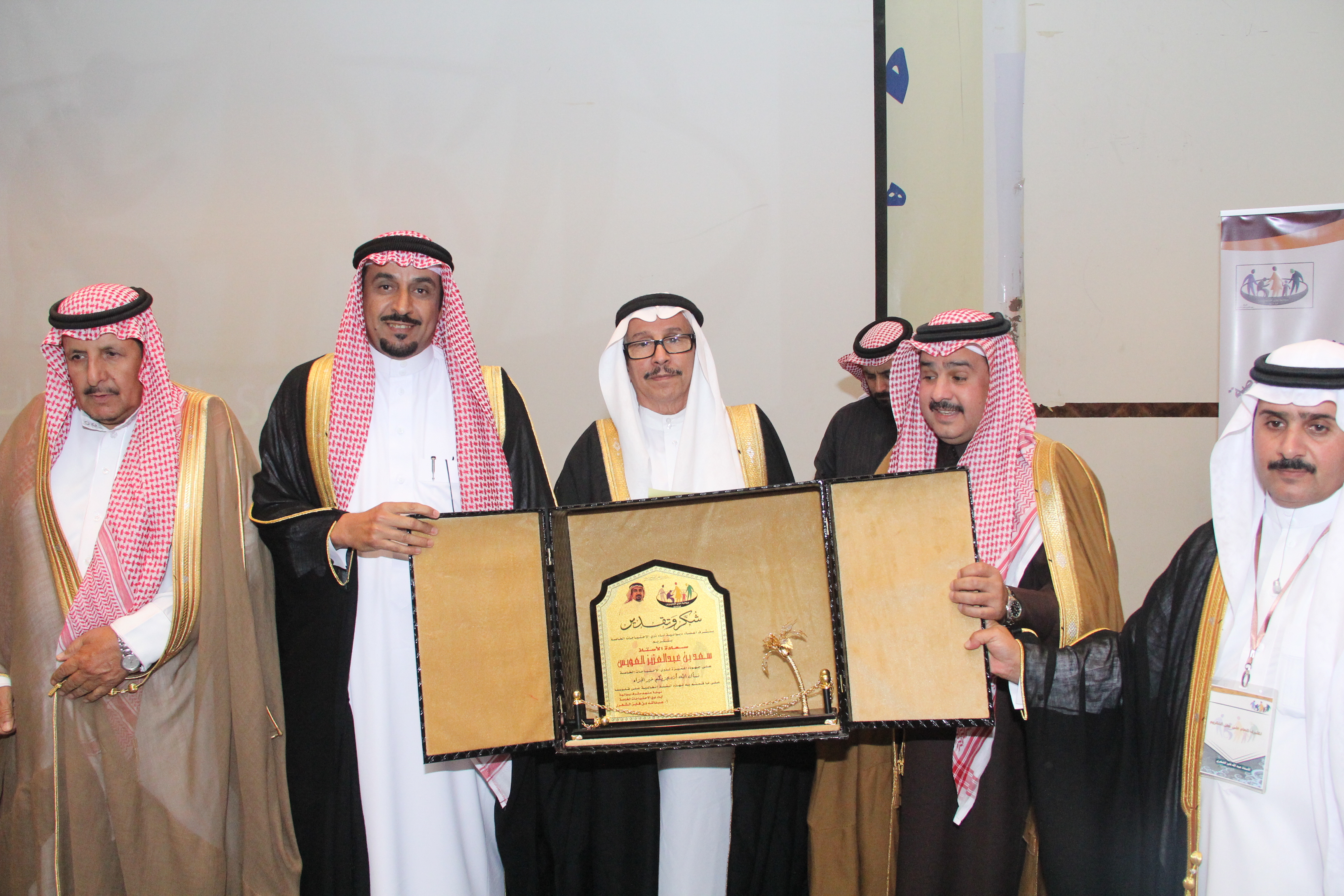 أقام أولياء أمور ذوي الاحتياجات الخاصة حفلاً تكريمياً للاستاذ سعد بن عبدالعزيز العويس نظير جهوده المميزة وسعيه الدؤب لخدمة تلك الفئة الغالية وذلك في مركز البابطبن الثقافي بحضور العديد من المسؤولين والاكاديميين والمهتمين والداعمين وأولياء الأمور ، وقد أعد برنامجاً خطابياً بهذه المناسبة تنوعت فقراته حيث القى سعادة الاستاذ الدكتور عبدالمحسن بن سعد العتيبي نائب جمعية أسر التوحد كلمة بهذه المناسبة ، كما القى مشرف ديوانية آباء ذوي الاحتياجات الخاصة الاستاذ عبدالله بن فايز الشهري كلمته بهذه المناسبة ، ثم تحدث المحتفى به للحضور مجدداً العزم على مواصلة مسيرة عمله الدؤب لخدمة تلك الفئة، وفي مدخلة هاتفية أكدت سمو الأميرة سميرة الفرحان رئيسة جمعية أسر التوحد بالمملكة دعمها التام لكل مايخدم ذوي الاحتياجات الخاصة معبرة عن شكرها وتقدير لجهود المحتفى به وجميع أعضاء ديوانية آباء ذوي الاحتياجات الخاصة ،ثم توالت المشاركات والمداخلات المميزة والتي أثرت الحفل ، بعدها تم تقديم الهديا للمحتفى به وللجهات الداعمة والراعية .