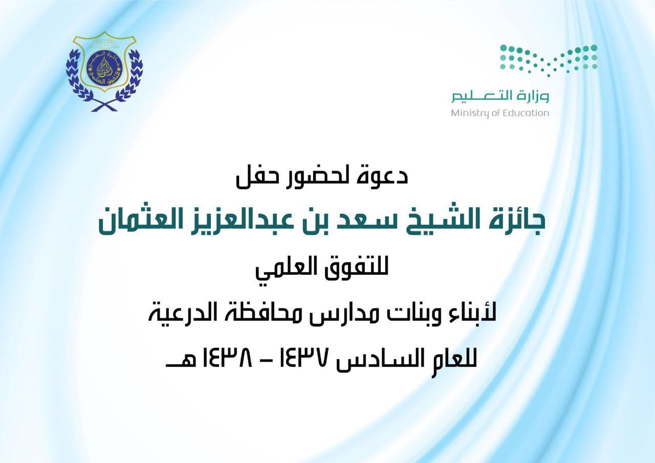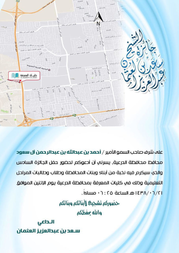 اكملت اللجان العاملة لجائزة العثمان للتفوق العلمي لمنسوبي محافظة الدرعية استعداداتها النهائية للحفل الختامي والذي سيقام مساء يوم الاثنين الموافق 21/6/1438 بكليات المعرفة برعاية كريمة من صاحب السمو الأمير أحمد بن عبدالله بن عبدالرحمن آل سعود محافظ محافظة الدرعية , وذلك في عامها السادس على التوالى حيث يترقب الطلاب والمعلمين نيل هذه الجائزة بعد عام دراسي أمضوه في الجد والمثابرة .