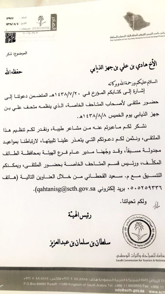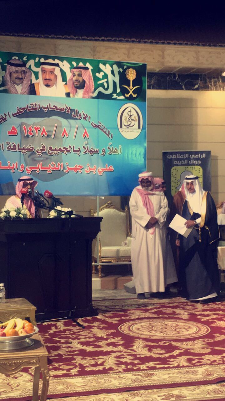 اصحاب المتاحف الخاصة بحضور مدير عام المتاحف الخاصة بالهيئة العامة للسياحةالمهندس / سعيد القحطاني وعدد من شيوخ القبائل ورؤساء المراكز والدوائر الحكومية ورجال الاعمال والمهتمين با الاثار والمتاحف