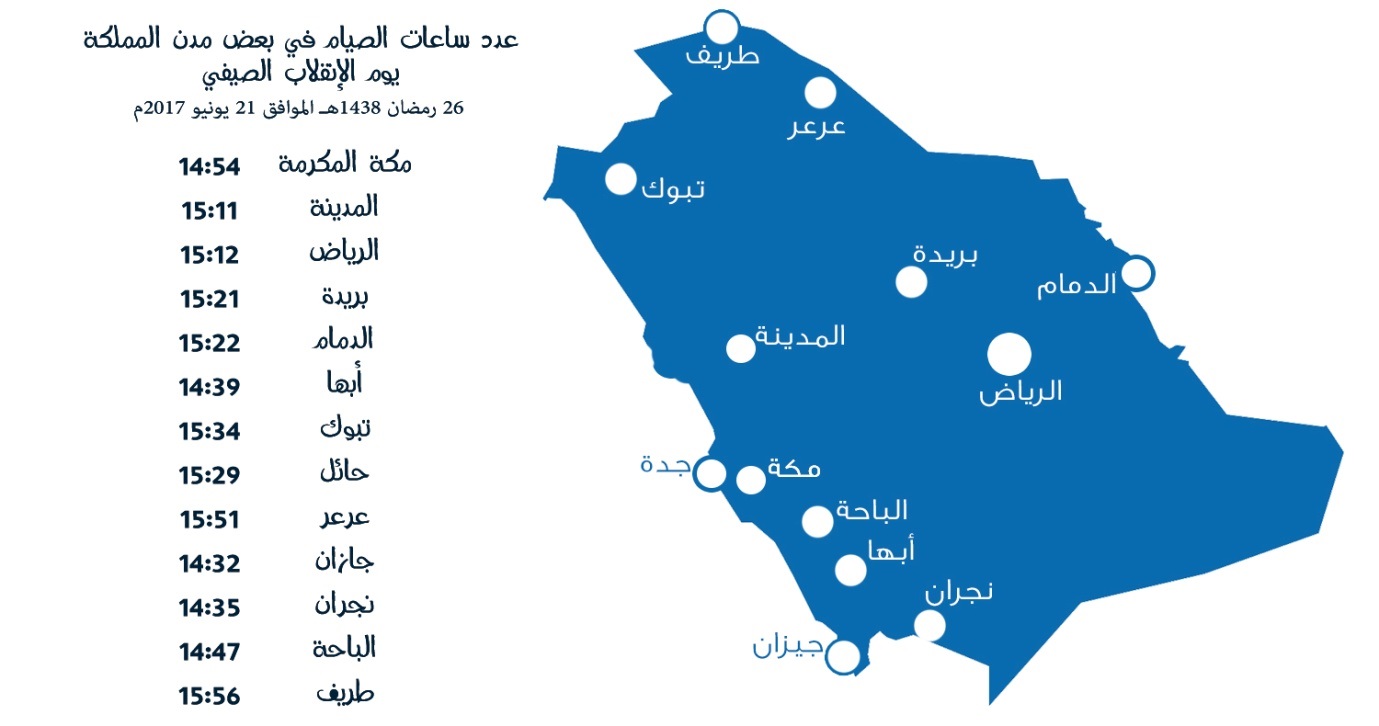 وكشف البلوشي عن الظاهرة الفلكية الثانية بقوله: ” ستحدث في يوم 26 رمضان الموافق 21 يونيو وتتمثل في حلول موعد الإنقلاب الصيفي فلكياً، وفيه أطول نهار في السنة على سكان النصف الشمالي من الكرة الأرضية . وبالتالي ستكون عدد ساعات الصيام في هذا اليوم هي الأكثر مقارنة بباقي أيام الشهر نفسه، مُشيراً بأنه وبسبب بعض العوامل الفلكية والجغرافية فإن مدة ساعات الصيام ستتفاوت (في هذا اليوم) بين مدن المملكة، وستحظى المدن الواقعة في الجزء الجنوبي من المملكة على أقل مدة في عدد ساعات الصيام، ففي جيزان ستكون مدة الصيام 14 ساعة و32 دقيقة تقريباً، وسيكون الوضع على العكس في مدن أقصى شمال المملكة، حيث ستقترب مدة الصيام في طريف مثلاً من 16 ساعة، وتحديداً ستكون مدة ساعات الصيام فيها في يوم الانقلاب الصيفي 15 ساعة و56 دقيقة تقريباً”.