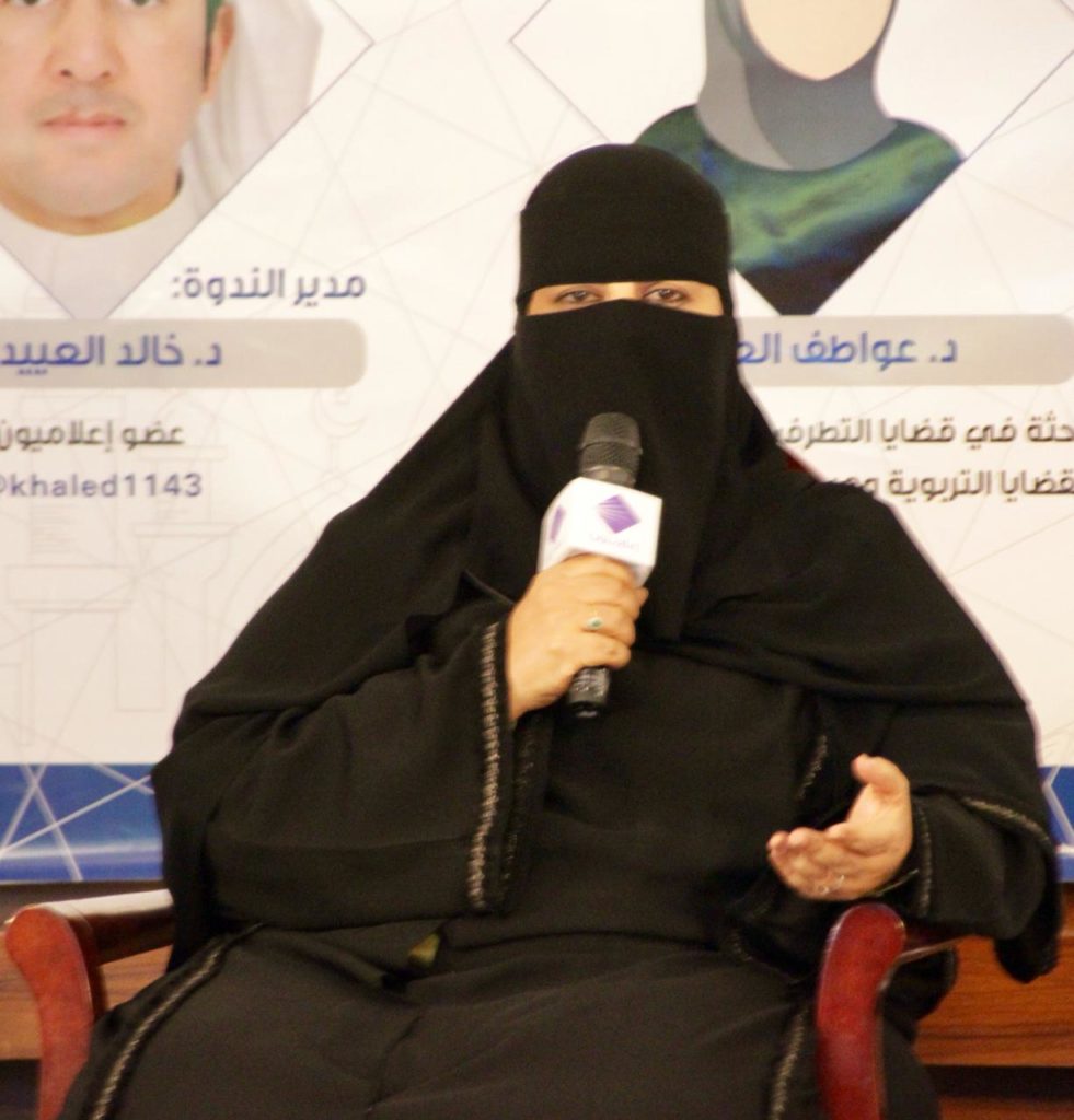 من جهتها، اعتبرت الدكتورة عواطف العتيبي إن حماية أطفالنا وشبابنا وشاباتنا أمر مهم للغاية ويجب أن نخطط لمستقبلهم لحفظ أمن وطننا، وأن هناك أسر كثيرة تلتزم الصمت ولا توضح للطفل الأحداث التي تجري حوله ومكامن العنف والأخطار التي يمكن أن تقع له سواء بقصد أو بغير قصد. وطالبت العتيبي بإجراء دراسات وبحوث متخصصة وعميقة لمعرفة الأساليب التي تستخدمها المنظمات الإرهابية مع أطفالنا، والتصدي لها من تنفيذ برامج وفعاليات ومبادرات وقائية تقضي عليها في مهدها.