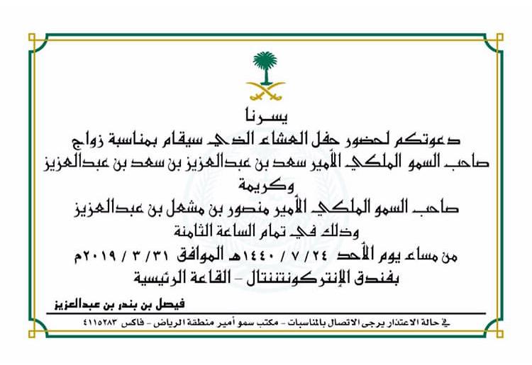 يحتفل أمير منطقة حائل صاحب السمو الملكي الأمير عبدالعزيز بن سعد بن عبدالعزيز آل سعود -يحفظه الله-، يوم غدٍ الأحد ٣١ مارس ٢٠١٩م بزواج نجله الأكبر (سعد) من كريمة صاحب السمو الملكي الأمير منصور بن مشعل بن عبدالعزيز آل سعود -يحفظه الله-، وذلك في قاعة فندق أنتركونتيننتال الرياض، حيث تم توزيع رقاع الدعوة للأمراء والمسؤولين وكبار الشخصيات والمشايخ ورجال الأعمال والأعيان ورجال الصحافة والإعلام ومنسوبي المجتمع الرياضي.