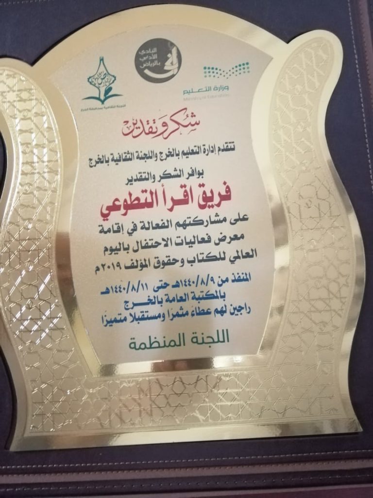 ضمن فعاليات اليوم العالمي للكتاب وحقوق المؤلف، قام فريق اقرأ التطوعي التابع للجنة الثقافية بالخرج والتي يشرف عليها النادي الأدبي بالرياض بالمشاركة بجناح في فعاليات المعرض المقام في مقر اللجنة الثقافية والمكتبة العامة بالخرج وقد استمر المعرض لمدة ثلاثة أيام ابتدأ من تاريخ ١٤٤٠/٨/٩هـ