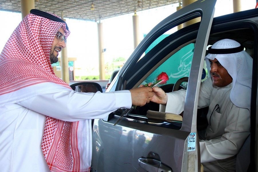 عايدت إدارة جمرك الرقعي أمس, المسافرين والقادمين إلى المملكة من دولة الكويت الشقيقة بتوزيع الورود والحلوى ومشاركتهم فرحة العيد.