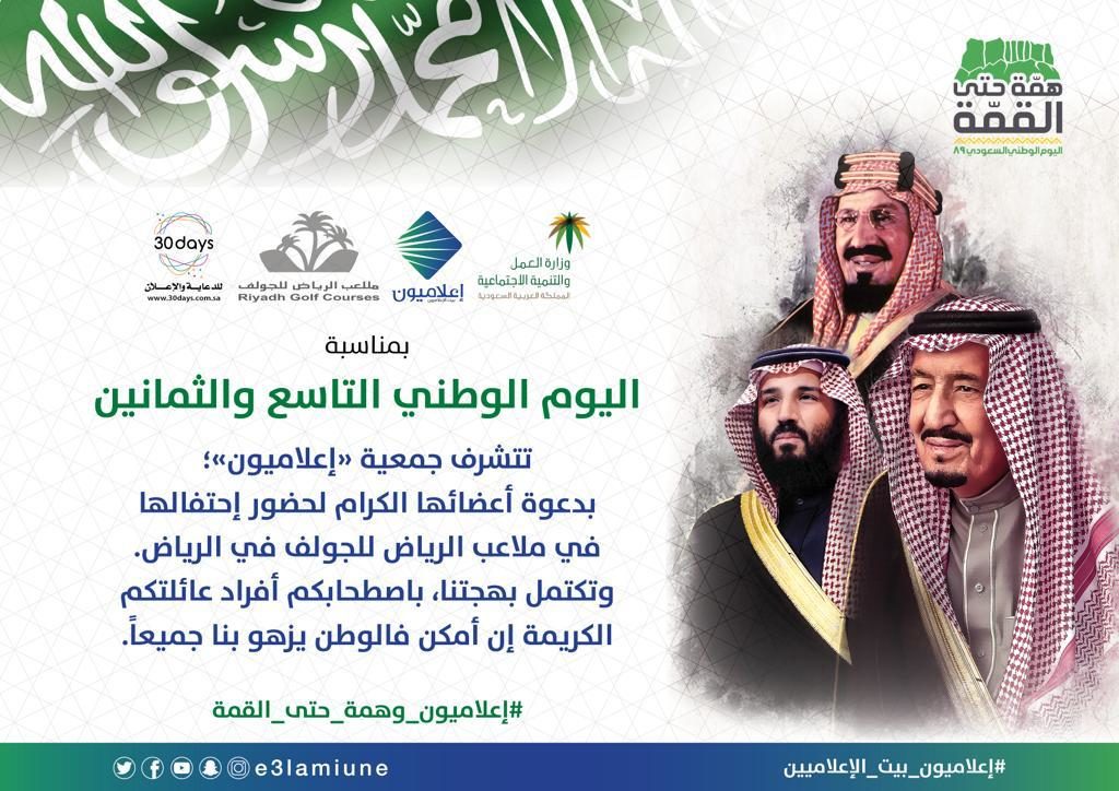 بمناسبة الذكرى لليوم الوطني التاسع والثمانون للمملكة العربية السعودية، تواكب جمعية “إعلاميون” هذه الذكرى العظيمة بحزمة فعاليات في أربع مناطق من وطننا الغالي.