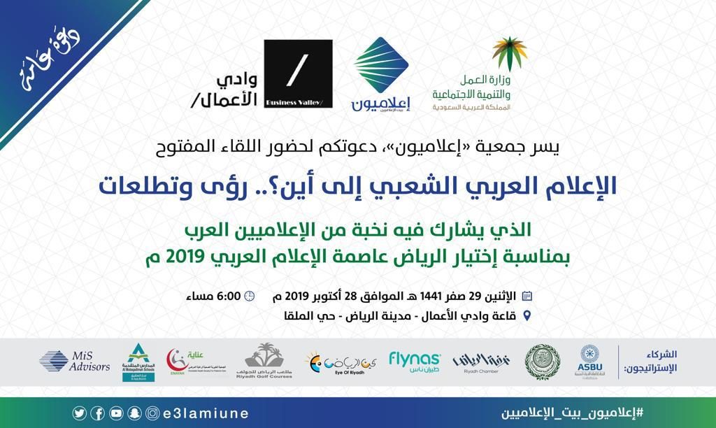 تنظم جمعية “إعلاميون” مساء اليوم الاثنين اللقاء الثقافي والإعلامي المفتوح (الإعلام العربي الشعبي إلى أين؟.. رؤى وتطلعات)، بمشاركة 34 متحدثاً من الإعلاميين السعوديين والعرب، بمناسبة اختيار الرياض عاصمة للإعلام العربي 2019م. ويبدء اللقاء تمام الساعة السادسة في قاعة وادي الأعمال في حي الملقا بمدينة الرياض.
