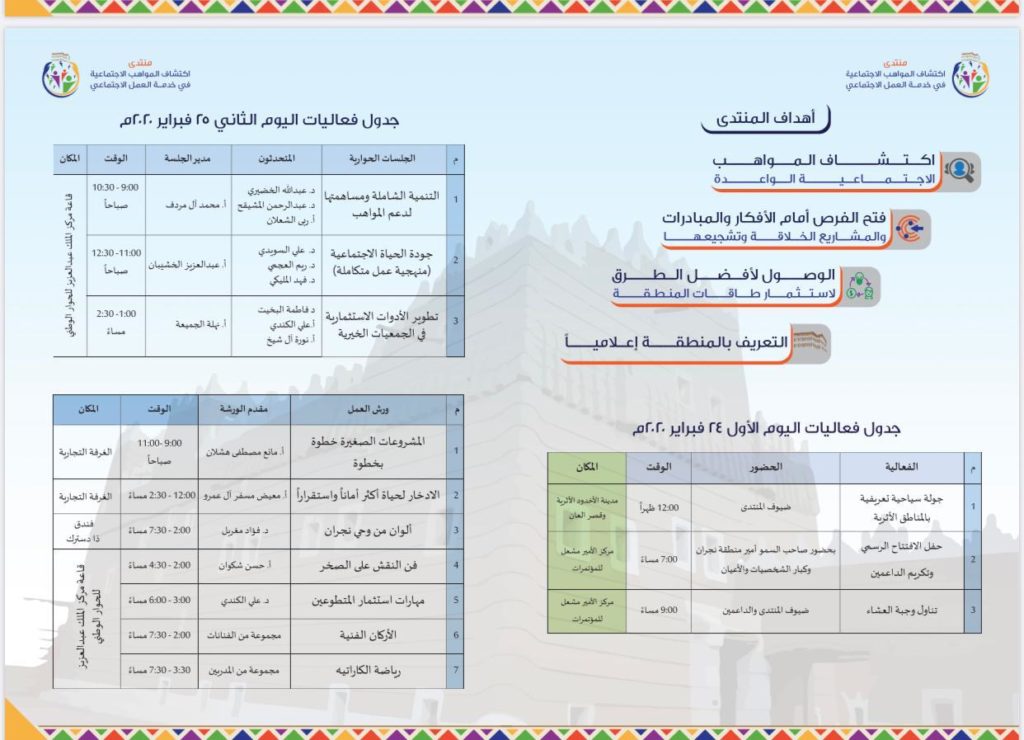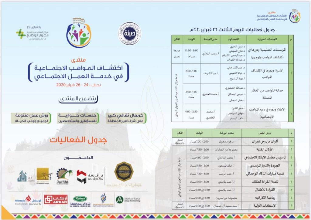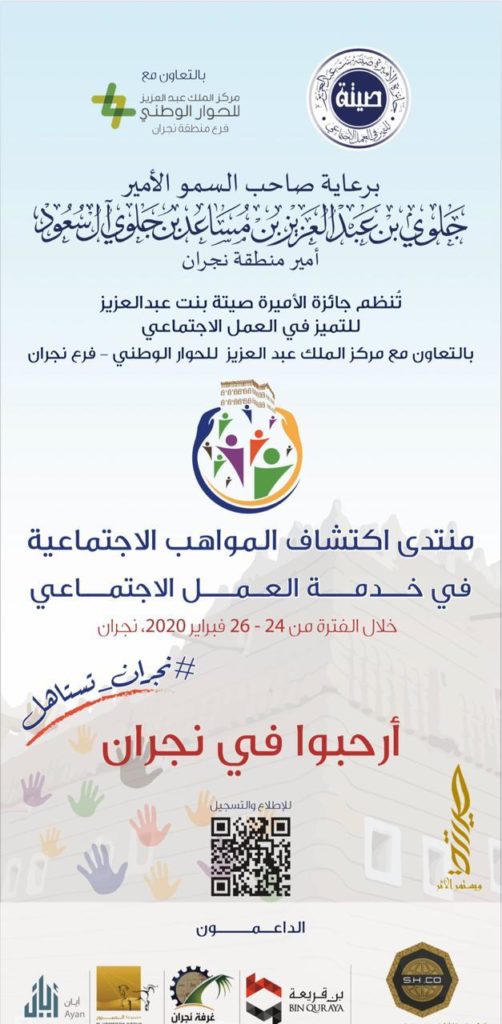 برعاية صاحب السمو الأمير جلوي بن عبد العزيز بن مساعد أمير منطقة نجران، تستعد حاضرة الجنوب نجران في هذه الآونة لاستضافة منتدى (اكتشاف المواهب الاجتماعية) الذي ينعقد خلال الفترة من 24 وحتى 26 من شهر فبراير الجاري، وتنظمه الأمانة العامة لجائزة الأميرة صيتة بنت عبد العزيز للتميز في العمل الاجتماعي بالتعاون مع مركز الحوار الوطني – فرع نجران.