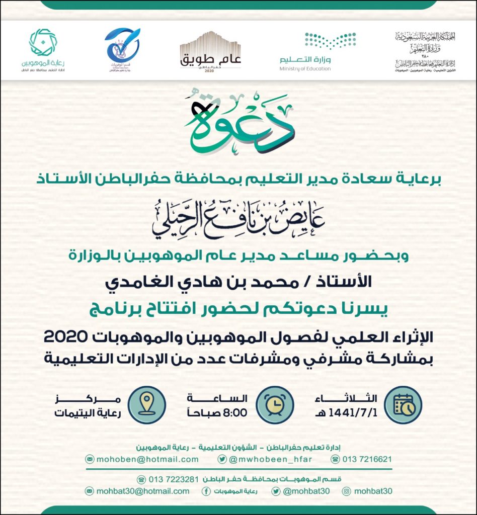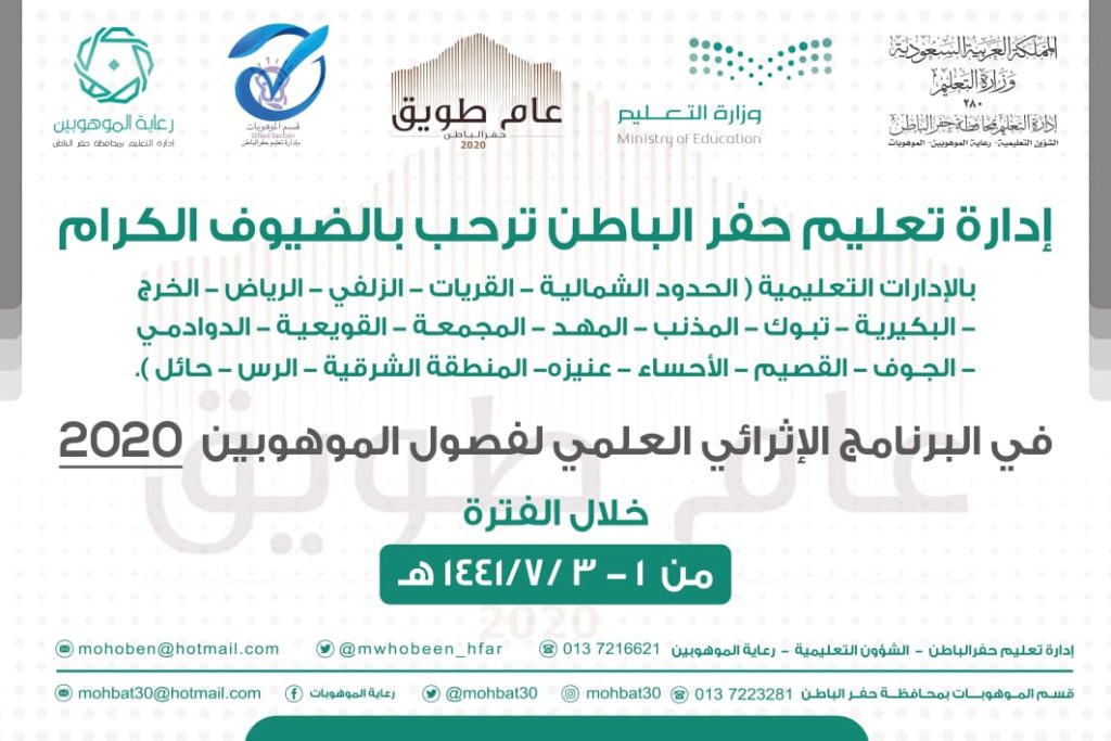 يدشن مساء غد الثلاثاء سعادة مدير تعليم حفرالباطن الأستاذ عايض بن نافع الرحيلي وبحضور مساعد مدير عام الموهوبين بالوزارة الأستاذ محمد بن هادي الغامدي برنامج الإثراء العلمي لفصول الموهوبين والموهوبات 2020 م بمشاركة أكثر من 70 مشرفاً ومشرفة في عدد من الإدارات التعليمية بمركز رعاية اليتيمات بالمحافظة .