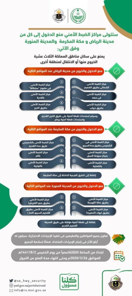 حدد وزارة الداخلية مراكز ضبط منع الدخول والخروج من المدن الثلاث الرياض ومكة والمدينة وذلك بعد توجيه خادم الحرمين بذلك حرصاً على سلامة وصحة المواطنين والمقيمين .