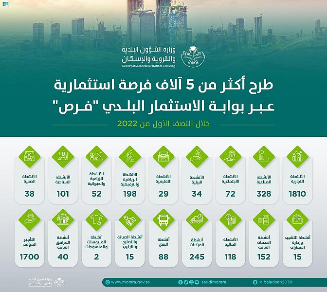 كشفت وزارة الشؤون البلدية والقروية والإسكان عن طرح أكثر من 5 آلاف فرصة استثمارية متنوعة في مدن المملكة خلال النصف الأول من العام 2022، وذلك ضمن الجهود المستمرة في تنمية الاستثمارات ورفع مستوى استدامة المدن وتنويع النشاط الاقتصادي فيها، بما يسهم في رفع جودة الحياة وتحقيق أهداف رؤية المملكة 2030.