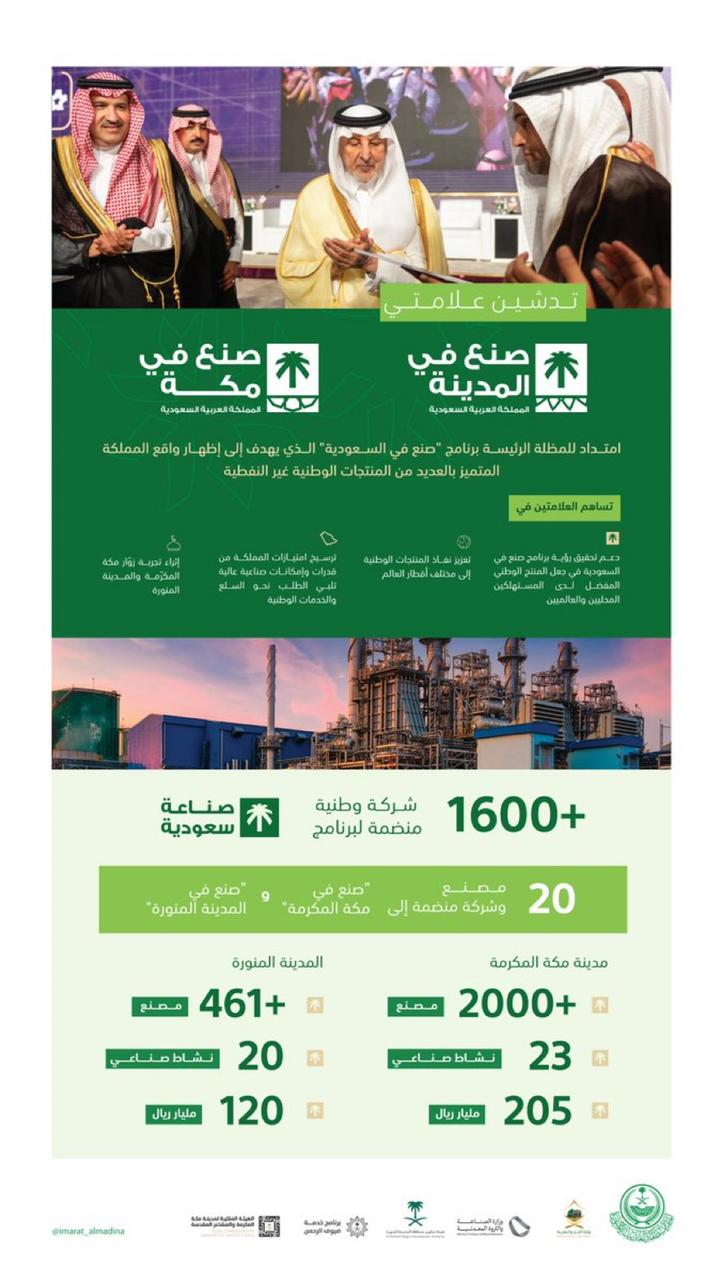 يذكر أن المنتجات والخدمات الوطنية المصنَّعة في مكة المكرمة والمدينة المنورة تحظى بأولوية وتفضيل لدى ضيوف الرحمن القادمين لأداء النسك من أنحاء العالم كافة، في حين ستجسِّد هويتي “صنع في مكة” و “صنع في المدينة”، جودة منتجاتنا الوطنية محليًّا وعالميًّا