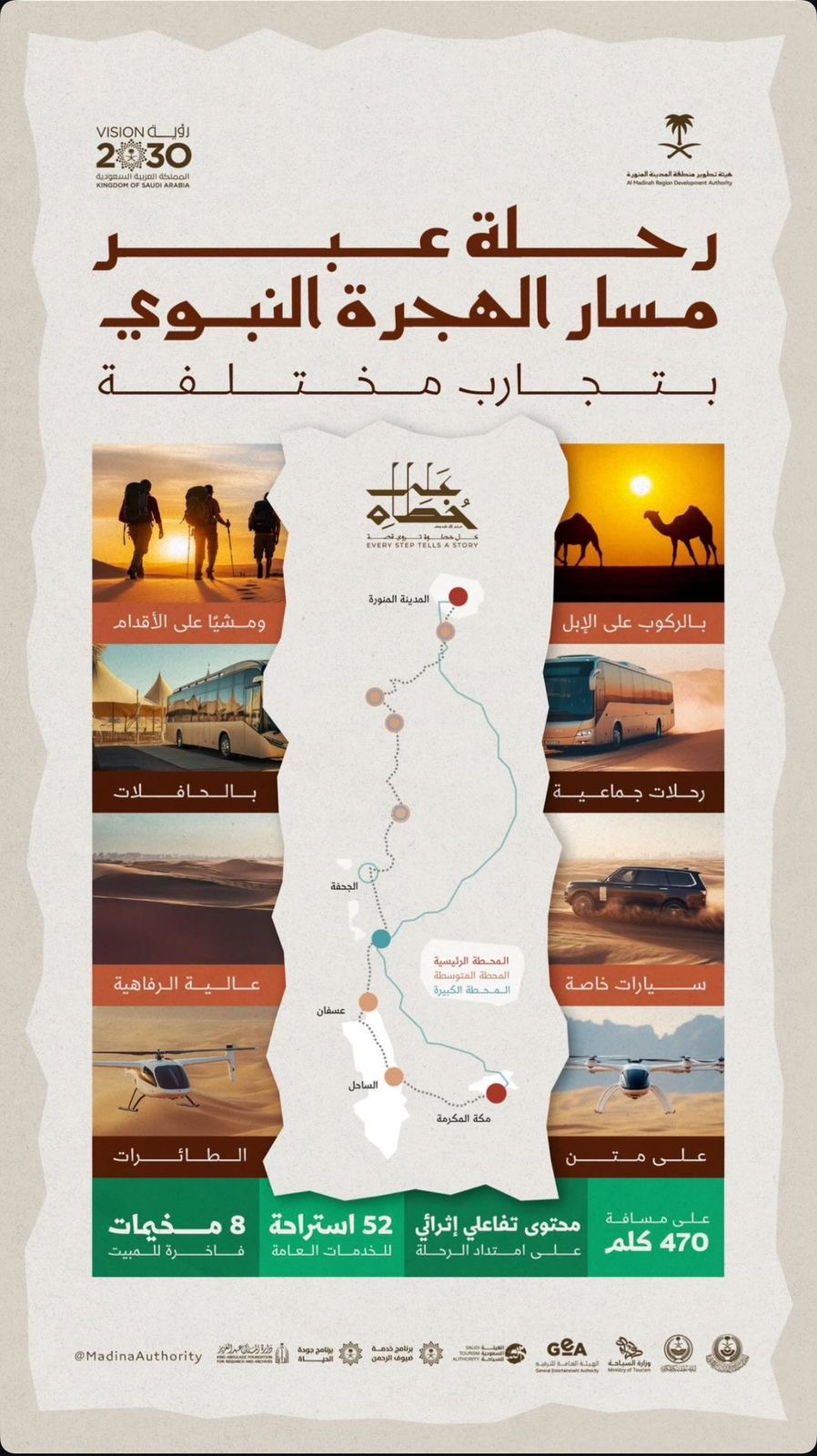ويستعرض المعرض عبر 14 محطة تفاعلية رحلة الهجرة النبوية، صُممت بدقة بمشاركة خبراء وباحثين محليين ودوليين؛ لتقديم محتوى موثق بأسلوب سردي معاصر يجمع بين التوثيق التاريخي والتجربة التفاعلية، مسلطًا الضوء على القيم الإنسانية والحضارية التي انطلقت منها الهجرة، وما تحمله من دروس في التخطيط والثبات وبناء المجتمعات، في رحلة امتدت قرابة 400 كيلومتر خلال ثمانية أيام، وكان لها أثر بالغ في المشهد الاجتماعي والسياسي والاقتصادي لشبه الجزيرة العربية.